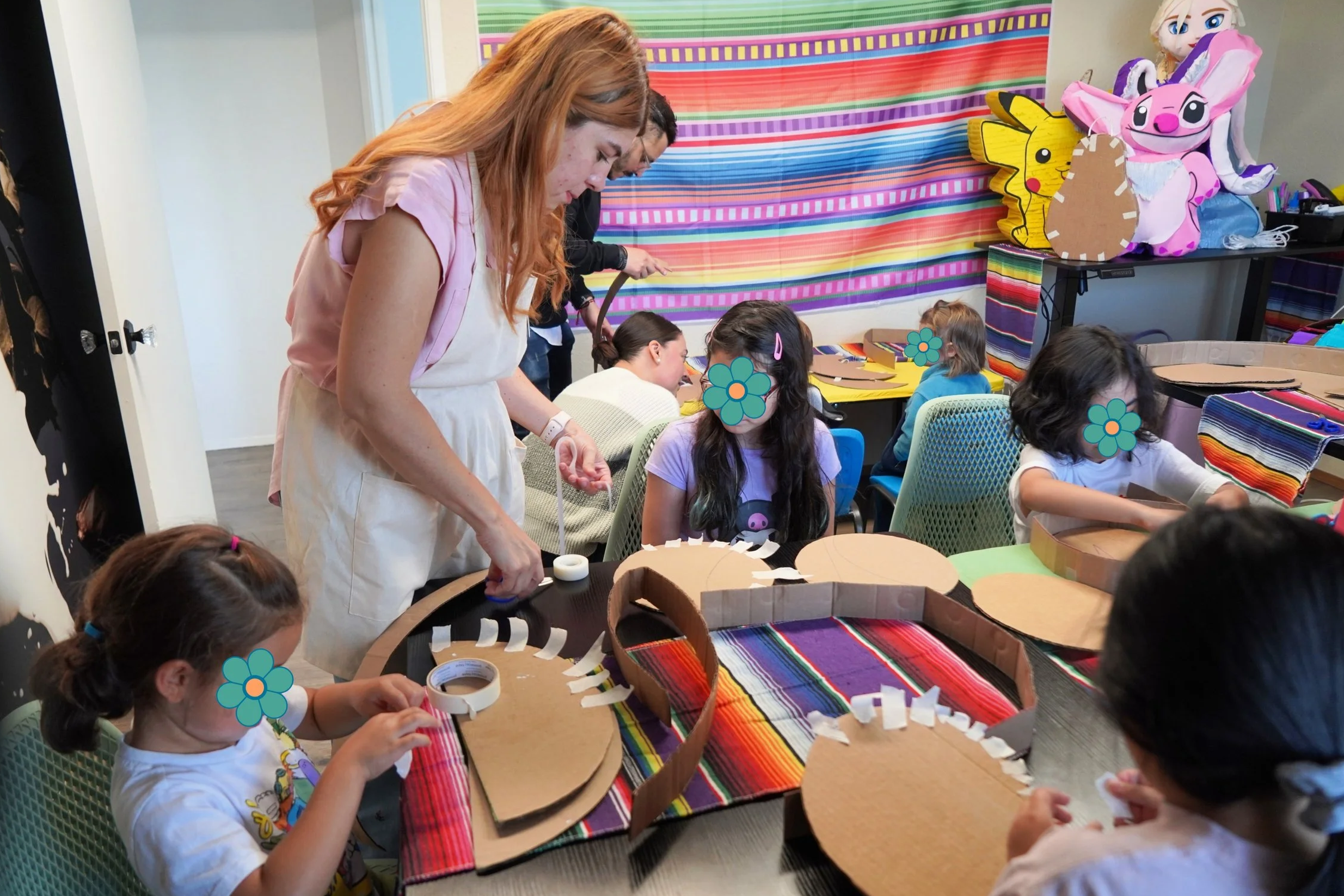 The session was led entirely in Spanish, with English supports to help everyone follow along and join in. Students practiced creative problem-solving as they designed and assembled their piñatas, learning how structure, symmetry, and balance help their creations take shape. Each child picked their own design from chili peppers, tacos, avocados, cacti, and circular forms ready for their imagination. The results were incredible! Two kids crafted chili peppers, one crafted a taco, while a few turned their avocado molds upside down to create sugar skulls. The circular ones became sunflowers, a pumpkin, and even the Cinnamoroll character piñata!